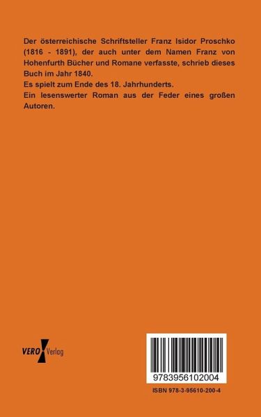 Der österreichische Schriftsteller Franz Isidor Proschko (1816 - 1891), der auch unter dem Namen Franz von Hohenfurth Bücher und Romane verfasste, schrieb dieses Buch im Jahr 1840. Es spielt zum Ende des 18. Jahrhunderts. Ein lesenswerter Roman aus der Feder eines großen Autoren.
