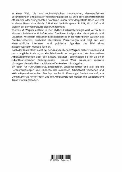 In einer Welt, die von technologischen Innovationen, demografischen Veränderungen und globaler Vernetzung geprägt ist, wird der Fachkräftemangel oft als eines der drängendsten Probleme unserer Zeit dargestellt. Doch wie real ist dieses Narrativ tatsächlich? Und welche Rolle spielen Politik, Wirtschaft und Medien bei der Verbreitung dieser Annahmen?Thomas M. Wagner entlarvt in Der Mythos Fachkräftemangel weit verbreitete Missverständnisse und liefert eine fundierte Analyse der Hintergründe und Ursachen. Mit einem kritischen Blick beleuchtet er die historischen Wurzeln des Fachkräftethemas, analysiert statistische Verzerrungen und zeigt auf, wie wirtschaftliche Interessen und politische Agenden das Bild eines allgegenwärtigen Mangels formen.Doch das Buch bleibt nicht bei der Analyse stehen: Wagner bietet visionäre und praxis-taugliche Ansätze, um die Arbeitswelt neu zu gestalten. Von innovativen Arbeitszeitmodellen über den Einsatz digitaler Technologien bis hin zu einer zukunftsorientierten Bildungspolitik - dieses Werk präsentiert konkrete Lösungen, die weit über traditionelle Denkweisen hinausgehen.Ein Buch für Führungskräfte, Entscheider, Wissenschaftler und alle, die die Herausforderungen und Chancen der modernen Arbeitswelt verstehen und aktiv mitgestalten wollen. Der Mythos Fachkräftemangel fordert uns auf, alte Denkmuster zu hinterfragen und die Arbeitswelt von morgen mit Weitsicht und Kreativität zu gestalten.
