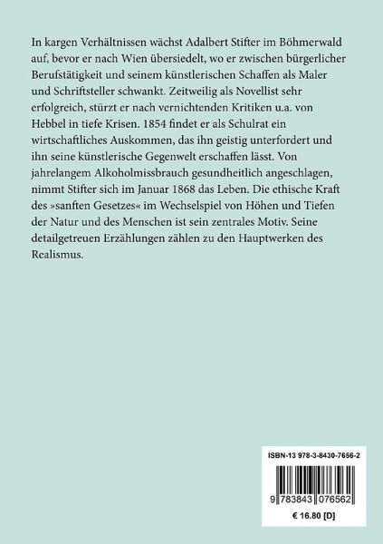 Adalbert Stifter: Der Nachsommer Entstanden zwischen 1847 und 1857, Erstdruck: Pest (Heckenast) 1857. Vollständige Neuausgabe mit einer Biographie des Autors. Herausgegeben von Karl-Maria Guth. Berlin 2015. Textgrundlage ist die Ausgabe: Adelbert Stifter: Gesammelte Werke in sechs Bänden, [herausgegeben von Max Stefl,] Band 4, 6.¿10. Tausend der Gesamtausgabe, Wiesbaden: Insel, 1959. Die Paginierung obiger Ausgabe wird in dieser Neuausgabe als Marginalie zeilengenau mitgeführt. Umschlaggestaltung von Thomas Schultz-Overhage unter Verwendung des Bildes: Carl Spitzweg, Rosenduft-Erinnerung, 1850. Gesetzt aus Minion Pro, 11 pt. Über den Autor: In kargen Verhältnissen wächst Adalbert Stifter im Böhmerwald auf, bevor er nach Wien übersiedelt, wo er zwischen bürgerlicher Berufstätigkeit und seinem künstlerischen Schaffen als Maler und Schriftsteller schwankt. Zeitweilig als Novellist sehr erfolgreich, stürzt er nach vernichtenden Kritiken u.a. von Hebbel in tiefe Krisen. 1854 findet er als Schulrat ein wirtschaftliches Auskommen, das ihn geistig unterfordert und ihn seine künstlerische Gegenwelt erschaffen lässt. Von jahrelangem Alkoholmissbrauch gesundheitlich angeschlagen, nimmt Stifter sich im Januar 1868 das Leben. Die ethische Kraft des »sanften Gesetzes« im Wechselspiel von Höhen und Tiefen der Natur und des Menschen ist sein zentrales Motiv. Seine detailgetreuen Erzählungen zählen zu den Hauptwerken des Realismus.