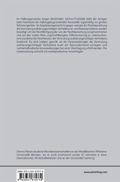 Im Haftungsprozess wegen fehlerhafter Ad-hoc-Publizität steht der Anleger beim Nachweis der haftungsbegründenden Kausalität regelmäßig vor großen Schwierigkeiten. Im Kapitalanlagerecht hingegen wendet die Rechtsprechung die Vermutung aufklärungsrichtigen Verhaltens an und Beweisprobleme werden beseitigt. Um die Rechtfertigung der von der Rechtsprechung vorgenommenen und auf den ersten Blick ungerechtfertigten Differenzierung zu untersuchen, wird zunächst die Rechtsnatur der Vermutung aufklärungsrichtigen Verhaltens bestimmt. Es wird sodann geprüft, ob die Voraussetzungen der Vermutung aufklärungsrichtigen Verhaltens auch am Sekundärmarkt vorliegen und rechtsmethodische Voraussetzungen bei einer Übertragung erfüllt werden. Die Untersuchung schließt mit rechtspolitischen Vorschlägen.