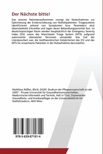 Das enorme Patientenaufkommen zwingt die Notaufnahmen zur Optimierung der Ersteinschätzung von Notfallpatienten. Triagesysteme identifizieren anhand von Symptomen bzw. Parametern akut lebensbedroht Erkrankte und legen deren Behandlungspriorität fest. Im deutschsprachigen Raum werden hauptsächlich der Emergency Severity Index (ESI) sowie das Manchester Triage System (MTS) aufgrund autorisierter übersetzter Versionen verwendet. Das Ziel der Literaturarbeit war, die testtheoretischen Gütekriterien des ESI und des MTS für erwachsene Patienten in der Notaufnahme darzustellen.