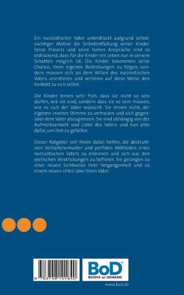 Ein narzisstischer Vater unterdrückt aufgrund selbstsüchtiger Motive die Selbstentfaltung seiner Kinder. Seine Präsenz und seine hohen Ansprüche sind so erdrückend, dass für die Kinder ein Leben nur in seinem Schatten möglich ist. Die Kinder bekommen keine Chance, ihren eigenen Bestrebungen zu folgen, sondern müssen sich an dem Willen des narzisstischen Vaters orientieren und verlieren auf diese Weise den Kontakt zu sich selbst.Die Kinder lernen sehr früh, dass sie nicht so sein dürfen, wie sie sind, sondern dass sie so sein müssen, wie es sich der Vater wünscht. Sie lernen nicht, der eigenen inneren Stimme zu vertrauen und sich gegenüber dem Vater abzugrenzen. Sie sind abhängig von der Aufmerksamkeit und Liebe des Vaters und tun alles dafür, um ihm zu gefallen.Dieser Ratgeber soll Ihnen dabei helfen, die destruktiven Verhaltensmuster und perfiden Methoden eines narzisstischen Vaters zu erkennen und sich aus den seelischen Verstrickungen zu befreien. Sie gelangen zu einer neuen Sichtweise Ihrer Vergangenheit und zu einem neuen Urteil über Ihren Vater. Dieses Buch beinhaltet zudem eine Meditation als MP3-Datei.