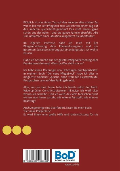 Plötzlich ist von einem Tag auf den anderen alles anders! So war es bei mir. Seit Pfingsten 2017 war ich von einem Tag auf den anderen querschnittsgelähmt! Das wirft einem ganz schön aus der Bahn - und die ganze Familie ebenfalls. Alle sind urplötzlich einer Situation ausgesetzt, die überfordert.Im eigenen Interesse habe ich mich mit der Pflegeversicherung, dem Pflegereformgesetz und der gesamten Sozialversicherung auseinandergesetzt. Ich wollte wissen:Habe ich Ansprüche aus der gesetzlichen Pflegeversicherung? Wenn ja: Was steht mir zu?Ich habe einen Dschungel von Unterlagen durchgearbeitet. In meinem Buch: "Der neue Pflegeblock" habe ich alles in möglichst einfacher Sprache, ohne störende Gesetzestexte, Paragraphen usw. auf den Punkt gebracht.Alles, was sie darin lesen, habe ich bereits selbst durchlebt. Widersprüche, Gerichtsstreitereien inklusive. Ich weiß also, wovon ich schreibe. Und ich weiß, das viele Menschen nicht wissen, was ihnen zusteht, wie man es feststellt, wie man es beantragt.Auch Angehörige sind überfordert. Lesen Sie mein Buch: "Der neue Pflegeblock". Es wird ihnen eine große Hilfe und Unterstützung für sie selbst oder zu pflegende Angehörige sein.