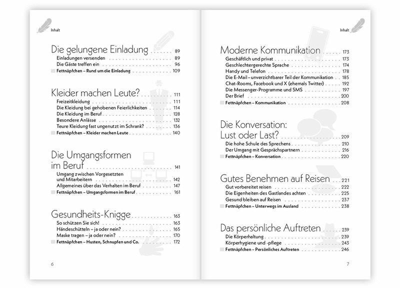 Diese 6. überarbeitete Auflage bietet viel Aktuelles wie: Kleiner Gesundheits-Knigge, Maskentragen, Händeschütteln und andere Achtsamkeiten. Ebenso Tipps und Tricks zur Gendersprache. Die moderne Kommunikation - Netiquette - am Smartphone, im E-Mail- Verkehr, und in den sozialen Netzwerken findet in diesem praktischen Ratgeber genügend Platz. Dieses Kapitel finde ich sehr wichtig, denn auf dem Gebiet scheinen doch einige Nutzer die Hilfe des " Knigge " nötig zu haben. Leider ist es aber häufig so, dass Menschen, die sich vorbildlich verhalten den Ratgeber lesen, und Andere auf einen freundlichen Umgangston im Grunde genommen keinen Wert legen.