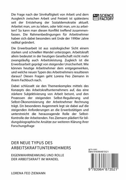 Die Frage nach der Sinnhaftigkeit von Arbeit und dem Ausgleich zwischen Arbeit und Freizeit ist spätestens seit der Entstehung der Sozialdemokratie aktuell. Arbeitet man, um zu leben, oder lebt man, um zu arbeiten? So kann man diesen Konflikt treffend zusammenfassen. Die Rahmenbedingungen für Arbeitnehmer haben sich dabei besonders seit Ende der 1990er Jahre radikal geändert.Die Erwerbsarbeit ist aus soziologischer Sicht einem starken und schnellen Wandel unterzogen. Arbeitskraft allein bedeutet in der heutigen Gesellschaft nicht mehr zwangsläufig auch Arbeitsleistung. Zugleich ist die Erwerbsarbeit geprägt von steigender Unsicherheit. Wie können heutige Arbeitnehmer dem entgegenwirken, und welche neuen Typen des Arbeitnehmers resultieren daraus? Diesen Fragen geht Lorena Feo Ziemann in ihrem Fachbuch nach.Dabei schlüsselt sie den Themenkomplex mittels des Konzepts des Arbeitskraftunternehmers auf, das eine stärkere Subjektivierung von Arbeit betont, und den Prozessen der steigenden Selbst-Regulierung und Selbst-Ökonomisierung der Arbeitnehmer Rechnung trägt. Ein besonderes Augenmerk legt sie dabei auf die steigenden Anforderungen an die Erwerbstätigen und unterstreicht die herausragende Rolle der Selbst-Kontrolle der Arbeitenden. Feo Ziemann plädiert für bildungsbiographische Ansätze zur weiteren Klärung ihrer Forschungsfrage.Aus dem Inhalt: -McDonaldization; -idealtypsicher Arbeitnehmer;-Fordismus;-Taylorismus,-Subjektivierung von Arbeit