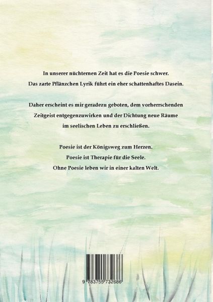 In unserer nüchternen Zeit hat es die Poesie schwer.Das zarte Pflänzchen Lyrik führt ein eher schattenhaftes Dasein.Daher erscheint es mir geradezu geboten, dem vorherrschenden Zeitgeist entgegenzuwirken und der Dichtung neue Räume im seelischen Leben zu erschließen.Poesie ist der Königsweg zum Herzen.Poesie ist Therapie für die Seele.Ohne Poesie leben wir in einer kalten Welt.Der vorliegende Band enthält Gedichte zu den folgenden Themen:Natur, Lebensweisheit, Liebe und Freundschaft, privates Leben, Gelegenheitsgedichte, Pandemie und Politik.