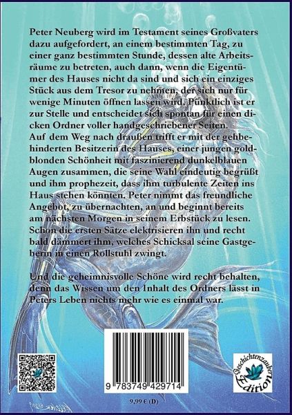 Peter Neuberg wird im Testament seines Großvaters dazu aufgefordert, an einem bestimmten Tag, zu einer ganz bestimmten Stunde, dessen alte Arbeitsräume zu betreten, auch dann, wenn die Eigentümer des Hauses nicht da sind und sich ein einziges Stück aus dem Tresor zu nehmen, der sich nur für wenige Minuten öffnen lassen wird. Pünktlich ist er zur Stelle und entscheidet sich spontan für einen dicken Ordner voller handgeschriebener Seiten.Auf dem Weg nach draußen trifft er mit der gehbehinderten Besitzerin des Hauses, einer jungen goldblonden Schönheit mit faszinierend dunkelblauen Augen zusammen, die seine Wahl eindeutig begrüßt und ihm prophezeit, dass ihm turbulente Zeiten ins Haus stehen könnten. Peter nimmt das freundliche Angebot, zu übernachten, an und beginnt bereits am nächsten Morgen in seinem Erbstück zu lesen.Schon die ersten Sätze elektrisieren ihn und recht bald dämmert ihm, welches Schicksal seine Gastgeberin in einen Rollstuhl zwingt.Und die geheimnisvolle Schöne wird recht behalten, denn das Wissen um den Inhalt des Ordners lässt in Peters Leben nichts mehr wie es einmal war.