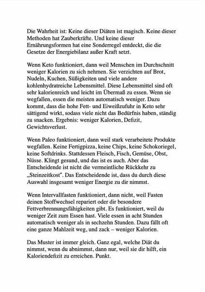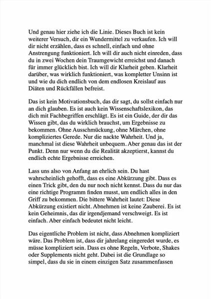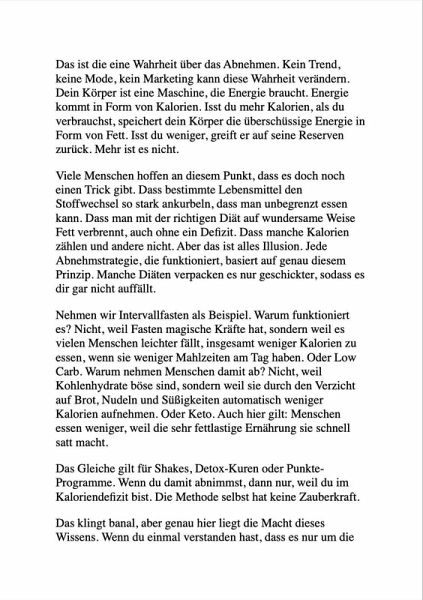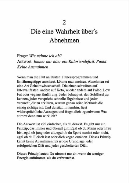 Mal ehrlich: Du bist nicht hier, um dich von der nächsten Diät verarschen zu lassen. Du bist hier, weil du endlich wissen willst, was wirklich funktioniert. Dieses Buch gibt dir keine Sprüche - sondern Antworten. Klare, direkte, ungeschönte Antworten auf all die Fragen, bei denen dich andere im Nebel stehen lassen: ¿ Brauche ich eine spezielle Diät? ¿¿ Nein. Keto, Paleo, Intervallfasten - alles nur Werkzeuge. Funktioniert nur, wenn das Defizit stimmt. ¿ Muss ich Kalorien zählen? ¿¿ Nein - aber du musst wissen, wie du deine Energiezufuhr im Griff behältst. ¿ Sind Kohlenhydrate böse? ¿¿ Bullshit. Brot, Nudeln & Reis machen dich nicht dick - zu viele Kalorien schon. ¿ Macht Fett fett? ¿¿ Nur, wenn du's übertreibst. Gesunde Fette sind dein Freund, nicht dein Feind. ¿ Brauche ich Sport, um abzunehmen? ¿¿ Nein. Bewegung hilft - aber du kannst auch ohne Fitnessstudio Ergebnisse sehen. ¿ Warum ist Eiweiß so wichtig? ¿¿ Weil es dich satt hält, Muskeln schützt und deinen Stoffwechsel ankurbelt - der unterschätzte Gamechanger. ¿ Darf ich Pizza, Schokolade und Bier? ¿¿ Ja. Wenn du das Prinzip verstanden hast, darfst du alles essen. ¿ Wie gehe ich mit Heißhunger und Rückschlägen um? ¿¿ Nicht mit Schuldgefühlen, sondern mit Strategien. Rückschläge gehören dazu - du lernst, wie du sie überstehst, ohne alles hinzuschmeißen. ¿ Wie halte ich langfristig mein Gewicht? ¿¿ Nicht durch ständige Diäten, sondern durch Gewohnheiten, die bleiben - einfach, realistisch, machbar. Hier gibt's keine Verbote, keine Zaubertricks und keine Detox-Lügen. Nur ehrliches Wissen, das funktioniert - wissenschaftlich fundiert, praktisch erklärt und alltagstauglich. Wenn du genug hast von Marketing-Quatsch, widersprüchlichen Tipps und schlechtem Gewissen nach jedem Stück Kuchen, dann ist das dein Guide. Kein Blabla. Kein Fachchinesisch. Kein Bullshit. Nur Antworten, die dir endlich Klarheit geben. Der No-Bullshit Abnehm Guide ¿ Für alle, die keine Ausreden mehr wollen - sondern Ergebnisse.