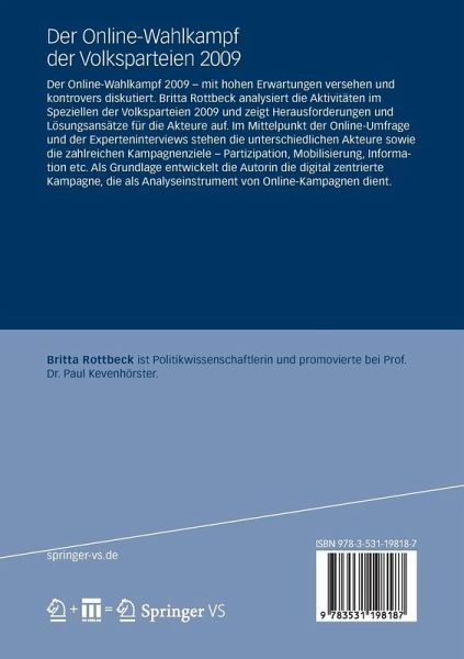 Der Online-Wahlkampf 2009 - mit hohen Erwartungen versehen und kontrovers diskutiert. Britta Rottbeck analysiert die Aktivitäten im Speziellen der Volksparteien 2009 und zeigt Herausforderungen und Lösungsansätze für die Akteure auf. Im Mittelpunkt der Online-Umfrage und der Experteninterviews stehen die unterschiedlichen Akteure sowie die zahlreichen Kampagnenziele - Partizipation, Mobilisierung, Information etc. Als Grundlage entwickelt die Autorin die digital zentrierte Kampagne, die als Analyseinstrument von Online-Kampagnen dient.