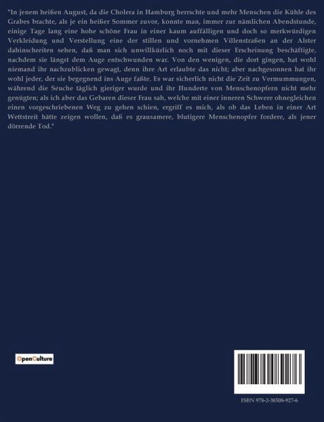 "In jenem heißen August, da die Cholera in Hamburg herrschte und mehr Menschen die Kühle des Grabes brachte, als je ein heißer Sommer zuvor, konnte man, immer zur nämlichen Abendstunde, einige Tage lang eine hohe schöne Frau in einer kaum auffälligen und doch so merkwürdigen Verkleidung und Verstellung eine der stillen und vornehmen Villenstraßen an der Alster dahinschreiten sehen, daß man sich unwillkürlich noch mit dieser Erscheinung beschäftigte, nachdem sie längst dem Auge entschwunden war. Von den wenigen, die dort gingen, hat wohl niemand ihr nachzublicken gewagt, denn ihre Art erlaubte das nicht; aber nachgesonnen hat ihr wohl jeder, der sie begegnend ins Auge faßte. Es war sicherlich nicht die Zeit zu Vermummungen, während die Seuche täglich gieriger wurde und ihr Hunderte von Menschenopfern nicht mehr genügten; als ich aber das Gebaren dieser Frau sah, welche mit einer inneren Schwere ohnegleichen einen vorgeschriebenen Weg zu gehen schien, ergriff es mich, als ob das Leben in einer Art Wettstreit hätte zeigen wollen, daß es grausamere, blutigere Menschenopfer fordere, als jener dörrende Tod."