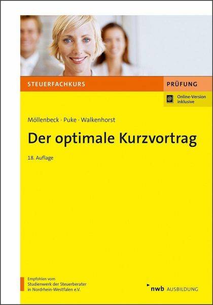 Ein optimal gehaltener Kurzvortrag ist der beste Einstieg in die mündliche Prüfung! Dieses bewährte Trainingsbuch zeigt Ihnen, was Sie beachten müssen, wie Sie ein Thema richtig aufbereiten und mit welchen Techniken und Tricks Sie Ihren Kurzvortrag überzeugend gestalten. Der erste Eindruck zählt! Obwohl der Kurzvortrag nur 1/7 der mündlichen Prüfung ausmacht, ist er psychologisch gesehen der wichtigste Teil. Ein gelungener Kurzvortrag zum Start der Prüfung schafft bei den Prüfern eine positive Einstellung und gibt Ihnen die nötige Sicherheit. Mit der 18. Auflage dieses bewährten "Trainers" gehen Sie perfekt vorbereitet in Ihren Kurzvortrag. So trainieren Sie unter anderem die effiziente Zeiteinteilung und die richtige Gewichtung der einzelnen Aspekte. 88 exemplarische Kurzvorträge zu Themen aus Ertragsteuer-, Handels-/Bilanzsteuerrecht, Umsatzsteuer- und Verfahrensrecht sowie zu anderen Rechtsthemen helfen Ihnen dabei, sich auf die verschiedenen Themengebiete gut vorzubereiten. Bewusst wurde dabei auf das Ausformulieren der Kurzvorträge verzichtet, um das freie Sprechen zu forcieren.InhaltsverzeichnisErtragsteuernHandelsrecht/BilanzsteuerrechtUmsatzsteuerVerfahrensrechtSonstige Rechtsthemen
