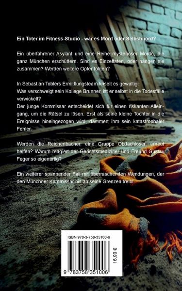 Ein Toter im Fitness-Studio - war es Mord oder Selbstmord? Ein überfahrener Asylant und eine Serie mysteriöser Morde, die ganz München erschüttern. Sind es Einzeltaten, oder hängen sie zusammen? Werden weitere Opfer folgen? In Sebastian Toblers Ermittlungsteam kriselt es gewaltig: Was verschweigt sein Kollege Brunner, ist er selbst in die Todesfälle verwickelt? Der junge Kommissar entscheidet sich für einen riskanten Alleingang, um die Rätsel zu lösen. Erst als seine kleine Tochter in die Ereignisse hineingezogen wird, dämmert ihm sein katastrophaler Fehler. Werden die Reichenbacher, eine Gruppe Obdachloser, erneut helfen? Warum reagiert der Gerichtsmediziner und Freund Gustav Feger so eigenartig? Ein weiterer spannender Fall mit überraschenden Wendungen, der den Münchner Kommissar bis an seine Grenzen treibt.