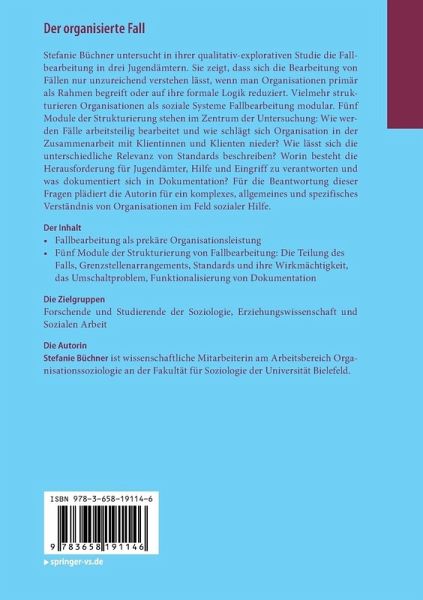 Stefanie Büchner untersucht in ihrer qualitativ-explorativen Studie die Fallbearbeitung in drei Jugendämtern. Sie zeigt, dass sich die Bearbeitung von Fällen nur unzureichend verstehen lässt, wenn man Organisationen primär als Rahmen begreift oder auf ihre formale Logik reduziert. Vielmehr strukturieren Organisationen als soziale Systeme Fallbearbeitung modular. Fünf Module der Strukturierung stehen im Zentrum der Untersuchung: Wie werden Fälle arbeitsteilig bearbeitet und wie schlägt sich Organisation in der Zusammenarbeit mit Klientinnen und Klienten nieder? Wie lässt sich die unterschiedliche Relevanz von Standards beschreiben? Worin besteht die Herausforderung für Jugendämter, Hilfe und Eingriff zu verantworten und was dokumentiert sich in Dokumentation? Für die Beantwortung dieser Fragen plädiert die Autorin für ein komplexes, allgemeines und spezifisches Verständnis von Organisationen im Feld sozialer Hilfe.