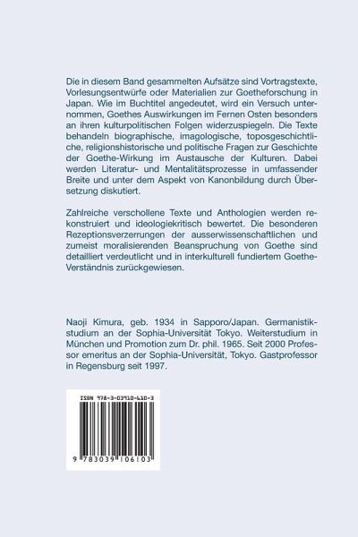 Die in diesem Band gesammelten Aufsätze sind Vortragstexte, Vorlesungsentwürfe oder Materialien zur Goetheforschung in Japan. Wie im Buchtitel angedeutet, wird ein Versuch unternommen, Goethes Auswirkungen im Fernen Osten besonders an ihren kulturpolitischen Folgen widerzuspiegeln. Die Texte behandeln biographische, imagologische, toposgeschichtliche, religionshistorische und politische Fragen zur Geschichte der Goethe-Wirkung im Austausch der Kulturen. Dabei werden Literatur- und Mentalitätsprozesse in umfassender Breite und unter dem Aspekt von Kanonbildung durch Übersetzung diskutiert.