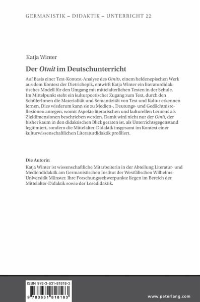 Auf Basis einer Text-Kontext-Analyse des Otnits, einem heldenepischen Werk aus dem Kontext der Dietrichepik, entwirft Katja Winter ein literaturdidaktisches Modell für den Umgang mit mittelalterlichen Texten in der Schule. Im Mittelpunkt steht ein kulturpoetischer Zugang zum Text, durch den SchülerInnen die Materialität und Semantizität von Text und Kultur erkennen lernen. Dies wiederum kann sie zu Medien-, Deutungs- und Gedächtnisreflexionen anregen, womit Aspekte literarischen und kulturellen Lernens als Zieldimensionen beschrieben werden. Damit wird nicht nur der Otnit, der bisher kaum in den didaktischen Blick geraten ist, als Unterrichtsgegenstand legitimiert, sondern die Mittelalter-Didaktik insgesamt im Kontext einer kulturwissenschaftlichen Literaturdidaktik profiliert.