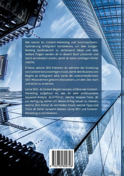 Wie kannst du Content-Marketing und Suchmaschinen-Optimierung erfolgreich kombinieren, um dein Google-Ranking kontinuierlich zu verbessern? Diese und viele weitere Fragen werden dir in diesem Buch praxisnah und leicht verständlich erklärt, damit du keine unnötigen Fehler machst.Erfahre, welche SEO-Faktoren du während der Erstellung von Content berücksichtigen musst, damit dein Business von Beginn an erfolgreich wird. Lerne die unterschiedlichsten SEO-Massnahmen gekonnt einzusetzen, um dein Ziel rasch und sicher zu erreichen. Lerne SEO- & Content Regeln kennen, erfahre wie Content-Marketing aufgebaut ist, wie du eine professionelle Keyword-Analyse durchführst, welche Analyse-Tools dir zur Verfügung stehen um deinen Erfolg besser zu messen, welche SEO-Fehler du vermeiden musst, welche Tipps und Tricks dir bisher verwahrt blieben. Lerne SEO und Content-Marketing zu kombinieren.