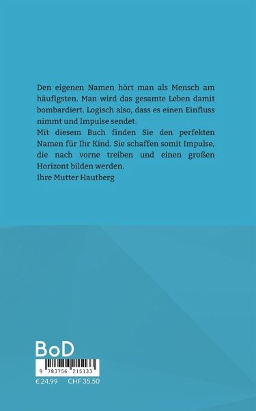 Den eigenen Namen hört man als Mensch am häufigsten. Man wird das gesamte Leben damit bombardiert. Logisch also, dass es einen Einfluss nimmt und Impulse sendet. Mit diesem Buch finden Sie den perfekten Namen für Ihr Kind. Sie schaffen somit Impulse, die nach vorne treiben und einen großen Horizont bilden werden. Ihre Mutter Hautberg