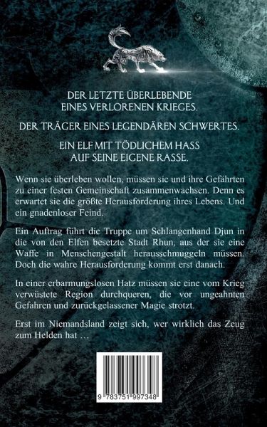 Der letzte Überlebende eines verlorenen Krieges. Der Träger eines legendären Schwertes. Ein Elf mit tödlichem Hass auf seine eigene Rasse.Wenn sie überleben wollen, müssen sie und ihre Gefährten zu einer festen Gemeinschaft zusammenwachsen. Denn es erwartet sie die größte Herausforderung ihres Lebens. Und ein gnadenloser Feind.Ein Auftrag führt die Truppe um Schlangenhand Djun in die von den Elfen besetzte Stadt Rhun, aus der sie eine Waffe in Menschengestalt herausschmuggeln müssen. Doch die wahre Herausforderung kommt erst danach. In einer erbarmungslosen Hatz müssen sie eine vom Krieg verwüstete Region durchqueren, die vor ungeahnten Gefahren und zurückgelassener Magie strotzt. Erst im Niemandsland zeigt sich, wer wirklich das Zeug zum Helden hat.
