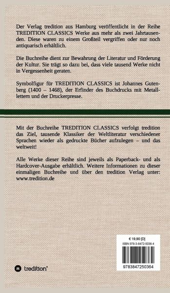 Diese Hardcover-Ausgabe ist Teil der TREDITION CLASSICS. Der Verlag tredition aus Hamburg veröffentlicht in der Buchreihe TREDITION CLASSICS Werke aus mehr als zwei Jahrtausenden. Diese waren zu einem Großteil vergriffen oder nur noch antiquarisch erhältlich. Mit TREDITION CLASSICS verfolgt tredition das Ziel, tausende Klassiker der Weltliteratur verschiedener Sprachen wieder als gedruckte Bücher zu verlegen und das weltweit! Die Buchreihe dient zur Bewahrung der Literatur und Förderung der Kultur. Sie trägt so dazu bei, dass viele tausend Werke nicht in Vergessenheit geraten.