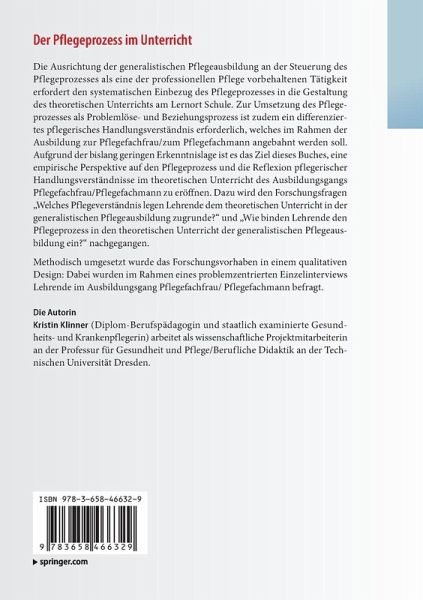 Die Ausrichtung der generalistischen Pflegeausbildung an der Steuerung des Pflegeprozesses als eine der professionellen Pflege vorbehaltenen Tätigkeit erfordert den systematischen Einbezug des Pflegeprozesses in die Gestaltung des theoretischen Unterrichts am Lernort Schule. Zur Umsetzung des Pflegeprozesses als Problemlöse- und Beziehungsprozess ist zudem ein differenziertes pflegerisches Handlungsverständnis erforderlich, welches im Rahmen der Ausbildung zur Pflegefachfrau/zum Pflegefachmann angebahnt werden soll. Aufgrund der bislang geringen Erkenntnislage ist es das Ziel dieses Buches, eine empirische Perspektive auf den Pflegeprozess und die Reflexion pflegerischer Handlungsverständnisse im theoretischen Unterricht des Ausbildungsgangs Pflegefachfrau/Pflegefachmann zu eröffnen. Dazu wird den Forschungsfragen "Welches Pflegeverständnis legen Lehrende dem theoretischen Unterricht in der generalistischen Pflegeausbildung zugrunde?" und "Wie binden Lehrende den Pflegeprozess in den theoretischen Unterricht der generalistischen Pflegeausbildung ein?" nachgegangen.