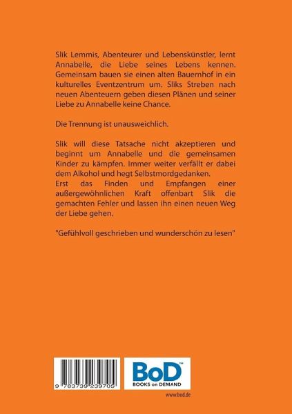 Slik Lemmis, Abenteurer und Lebenskünstler, lernt Annabelle, die Liebe seines Lebens kennen. Gemeinsam bauen sie einen alten Bauernhof in ein kulturelles Eventzentrum um. Sliks Streben nach neuen Abenteuern gibt diesen Plänen und seiner Liebe zu Annabelle keine Chance. Die Trennung ist unausweichlich. Slik will diese Tatsache nicht akzeptieren und beginnt um Annabelle und die gemeinsamen Kinder zu kämpfen. Immer weiter verfällt er dabei dem Alkohol und hegt Selbstmordgedanken.Erst das Finden und Empfangen einer außergewöhnlichen Kraft offenbart Slik die gemachten Fehler und lassen ihn einen neuen Weg der Liebe gehen."Gefühlvoll geschrieben und wunderschön zu lesen"