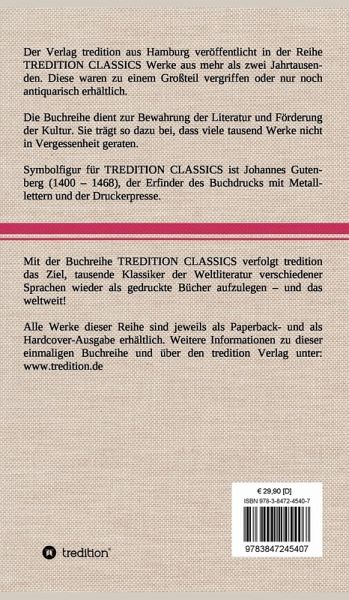 Diese Hardcover-Ausgabe ist Teil der TREDITION CLASSICS. Der Verlag tredition aus Hamburg veröffentlicht in der Buchreihe TREDITION CLASSICS Werke aus mehr als zwei Jahrtausenden. Diese waren zu einem Großteil vergriffen oder nur noch antiquarisch erhältlich. Mit TREDITION CLASSICS verfolgt tredition das Ziel, tausende Klassiker der Weltliteratur verschiedener Sprachen wieder als gedruckte Bücher zu verlegen und das weltweit! Die Buchreihe dient zur Bewahrung der Literatur und Förderung der Kultur. Sie trägt so dazu bei, dass viele tausend Werke nicht in Vergessenheit geraten.