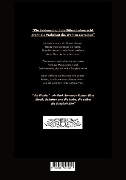 "Der Pianist" - Ein Roman zwischen Schatten, Musik und LeidenschaftDer Pianist ist ein hingebungsvoller Dark-Romance-Roman voller unerwarteter Wendungen und mystischer Intensität. Im Mittelpunkt stehen der gefeierte Pianist Lucien Vance und die geheimnisvolle Dark-Romance-Autorin Elara Blackwood. Zwei Seelen, die sich auf unerklärliche Weise begegnen - verbunden durch die Macht der Musik und die unsichtbaren Fäden der Schatten.Die Geschichte entfaltet sich im Theater von Elaras Vater, einem Ort voller Geheimnisse, in dem Realität und Inszenierung ineinanderfließen. Bei der Premiere des Stückes "Der Pianist" verschwimmen die Grenzen zwischen Bühne und Leben, und Lucien wie Elara werden hineingezogen in ein Spiel aus Leidenschaft, Gefahr und Offenbarung.Im Zentrum stehen nicht nur die überwältigende Kraft der Musik und Luciens Virtuosität am Klavier, sondern auch die dunkle Welt der Schatten und die geheimnisvolle Psychologie der Knoten, die das Unsichtbare an das Sichtbare binden.Während Elara versucht, die Wahrheit hinter dem Tod ihrer Mutter und die verborgene Geschichte ihres Vaters zu verstehen, entdeckt sie zugleich eine Liebe, die jenseits der Zeit widerhallt - eine Liebe, die, wie das Klingen der Tasten, von einem unsichtbaren Zuhörer bis in die Ewigkeit gehört wird.So wird Der Pianist zu einem Roman über Hingabe, Verlangen und die Macht der unsichtbaren Fäden, die Leben, Tod und Leidenschaft miteinander verweben.