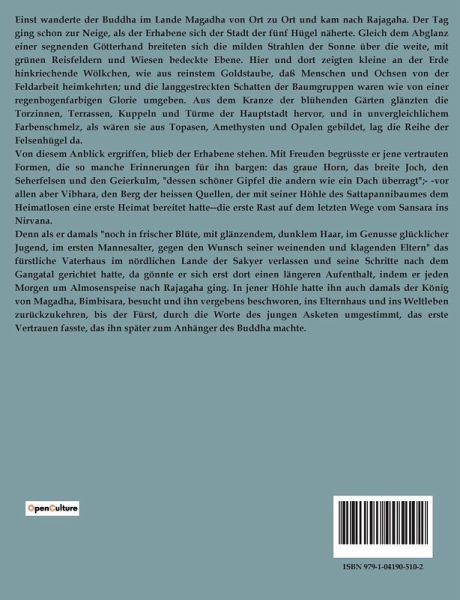 Einst wanderte der Buddha im Lande Magadha von Ort zu Ort und kam nach Rajagaha. Der Tag ging schon zur Neige, als der Erhabene sich der Stadt der fünf Hügel näherte. Gleich dem Abglanz einer segnenden Götterhand breiteten sich die milden Strahlen der Sonne über die weite, mit grünen Reisfeldern und Wiesen bedeckte Ebene. Hier und dort zeigten kleine an der Erde hinkriechende Wölkchen, wie aus reinstem Goldstaube, daß Menschen und Ochsen von der Feldarbeit heimkehrten; und die langgestreckten Schatten der Baumgruppen waren wie von einer regenbogenfarbigen Glorie umgeben. Aus dem Kranze der blühenden Gärten glänzten die Torzinnen, Terrassen, Kuppeln und Türme der Hauptstadt hervor, und in unvergleichlichem Farbenschmelz, als wären sie aus Topasen, Amethysten und Opalen gebildet, lag die Reihe der Felsenhügel da. Von diesem Anblick ergriffen, blieb der Erhabene stehen. Mit Freuden begrüsste er jene vertrauten Formen, die so manche Erinnerungen für ihn bargen: das graue Horn, das breite Joch, den Seherfelsen und den Geierkulm, "dessen schöner Gipfel die andern wie ein Dach überragt";- -vor allen aber Vibhara, den Berg der heissen Quellen, der mit seiner Höhle des Sattapannibaumes dem Heimatlosen eine erste Heimat bereitet hatte--die erste Rast auf dem letzten Wege vom Sansara ins Nirvana. Denn als er damals "noch in frischer Blüte, mit glänzendem, dunklem Haar, im Genusse glücklicher Jugend, im ersten Mannesalter, gegen den Wunsch seiner weinenden und klagenden Eltern" das fürstliche Vaterhaus im nördlichen Lande der Sakyer verlassen und seine Schritte nach dem Gangatal gerichtet hatte, da gönnte er sich erst dort einen längeren Aufenthalt, indem er jeden Morgen um Almosenspeise nach Rajagaha ging. In jener Höhle hatte ihn auch damals der König von Magadha, Bimbisara, besucht und ihn vergebens beschworen, ins Elternhaus und ins Weltleben zurückzukehren, bis der Fürst, durch die Worte des jungen Asketen umgestimmt, das erste Vertrauen fasste, das ihn später zum Anhänger des Buddha machte.