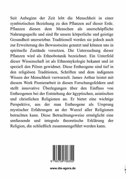 Seit Anbeginn der Zeit lebt die Menschheit in einer symbiotischen Beziehung zu den Pflanzen auf dieser Erde. Pflanzen dienen dem Menschen als unerschöpfliche Nahrungsquelle und sind für unsere körperliche und geistige Gesundheit unersetzbar. Traditionell werden sie jedoch auch zur Erweiterung des Bewusstseins genutzt und können uns in spirituelle Zustände versetzen. Die Untersuchung dieser Pflanzen wird als Ethnobotanik bezeichnet. Ein Unterfeld dieser Wissenschaft ist als Ethnomykologie bekannt und ist speziell den Pilzen gewidmet. Diese natürlichen Entheogene sind tief in den religiösen Traditionen, Schriften und dem indigenen Wissen der Menschheit verwurzelt. James Arthur leistet mit diesem Werk Pionierarbeit in diesen Forschungsfeldern und stellt innovative Überlegungen über den Einfluss von Entheogenen bei der Entstehung der ägyptischen, asiatischen und christlichen Religionen an. Er bietet eine wichtige Perspektive, aus der man Entheogene als Ursprung mystischer Erfahrungenan der Wurzel aller Religionen betrachten kann. Diese Betrachtungsweise ermöglicht eine umfassende und integrale theoretische Erklärung der Religion, die schließlich zusammengeführt werden kann.