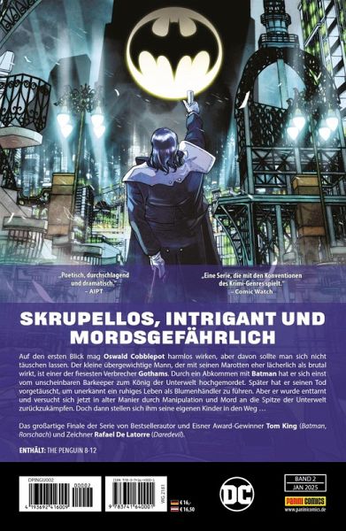 SKRUPELLOS, INTRIGANT UND MORDSGEFÄHRLICH Auf den ersten Blick mag Oswald Cobblepot harmlos wirken, aber davon sollte man sich nicht täuschen lassen. Der kleine übergewichtige Mann, der mit seinen Marotten eher lächerlich als brutal wirkt, ist einer der fiesesten Verbrecher Gothams. Durch ein Abkommen mit Batman hat er sich einst vom unscheinbaren Barkeeper zum König der Unterwelt hochgemordet. Später hat er seinen Tod vorgetäuscht, um unerkannt ein ruhiges Leben als Blumenhändler zu führen. Aber er wurde enttarnt und versucht sich jetzt in alter Manier durch Manipulation und Mord an die Spitze der Unterwelt zurückzukämpfen. Doch dann stellen sich ihm seine eigenen Kinder in den Weg ... Das großartige Finale der Serie von Bestsellerautor und Eisner Award-Gewinner Tom King (Batman, Rorschach) und Zeichner Rafael De Latorre (Daredevil). ENTHÄLT: THE PENGUIN 8-12