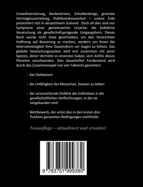 Geboren, verarscht, gestorben - das Leben des überwiegenden Teils unserer Artgenossen verläuft in relativ vorgezeichneten Bahnen. Die kollektive Verarschung als gesellschaftsprägende Umgangsform hat Tradition; sie trat ihren Siegeszug mit der Sesshaftwerdung des Menschen an und ist durch nichts und niemanden zu stoppen. Dieses Buch wurde auch nicht etwa geschrieben, um den Verarschten Hoffnung auf Besserung zu machen; es soll vielmehr ein bescheidener Beitrag dazu sein, sie von der Alternativlosigkeit ihres Schicksals zu überzeugen. Das Zusammenspiel von vier Komponenten garantiert den Fortbestand des globalen Verarschungssystems bis zu dem Zeitpunkt, an dem es zusammen mit jener Spezies, deren Vertreter es ersonnen haben, vom Antlitz dieses Planeten verschwinden wird. das Geldwesen die Unfähigkeit des Menschen, Staaten zu bilden der unzureichende Einblick der Individuen in die gesellschaftlichen Verflechtungen, in die sie eingebunden sind Wettbewerb, der unter den in den ersten drei Punkten genannten Bedingungen stattfindet.