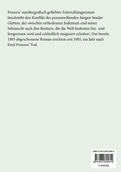 Karl Emil Franzos: Der Pojaz Lesefreundlicher Großdruck in 16-pt-Schrift Franzos' autobiografisch gefärbter Entwicklungsroman beschreibt den Konflikt des possenreißenden Jungen Sender Glatteis, der zwischen orthodoxem Judentum und seiner Sehnsucht nach den Brettern, die die Welt bedeuten hin- und hergerissen wird und schließlich resigniert scheitert. Der bereits 1893 abgeschlossene Roman erschien erst 1905, ein Jahr nach Emil Franzos' Tod. Großformat, 210 x 297 mm Berliner Ausgabe, 2019 Durchgesehener Neusatz mit einer Biographie des Autors bearbeitet und eingerichtet von Theodor Borken Textgrundlage ist die Ausgabe: Karl Emil Franzos: Der Pojaz. Mit einem Nachwort von Jost Hermand, Königstein/Ts.: Athenäum, 1979. Umschlaggestaltung von Thomas Schultz-Overhage unter Verwendung des Bildes: Lovis Corinth, Cesare Borgia (Arthur Kraft), 1914. Gesetzt aus der Minion Pro, 16 pt.