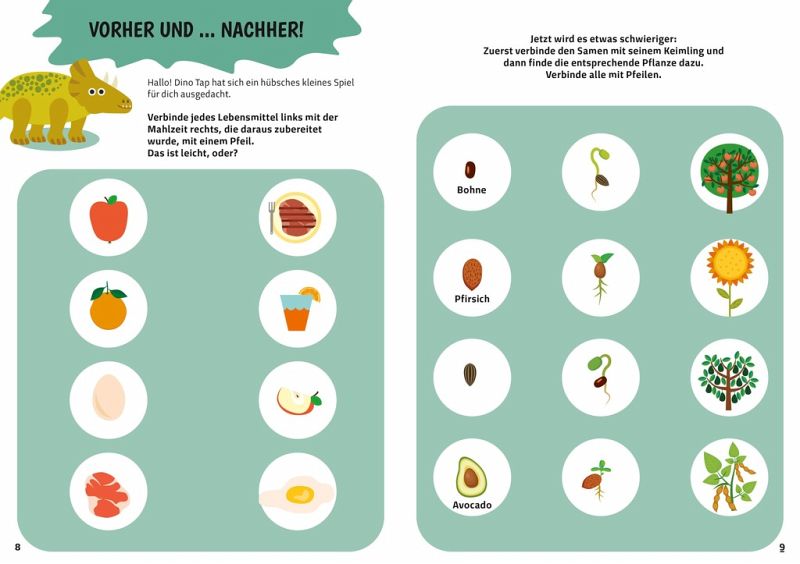 Vor vielen Millionen Jahren sah unsere Welt ganz anders aus: Damals lebten Dinosaurier, Flugsaurier und Meeresechsen. Tap, Tip und Tup sind drei sehr aktive Dinos, die mit Langeweile nichts am Hut haben! Sie zeigen dir als kleinem Saurierfan zig Möglichkeiten, damit dir niemals langweilig wird: Tangrams, Labyrinthe, Such- und Fehlerbilder, Puzzle-Rätsel, Memorys, eine prähistorische Schlacht, eine Schatzsuche, Origami, Bilderrätsel, erwarten dich. Ihre Aufgaben für dich werden immer kniffliger, du musst genau hinschauen. Mit einer abschreckenden, einer furchteinflößenden und einer schrecklichen Challenge heißt es für dich: Tschüss Langeweile!