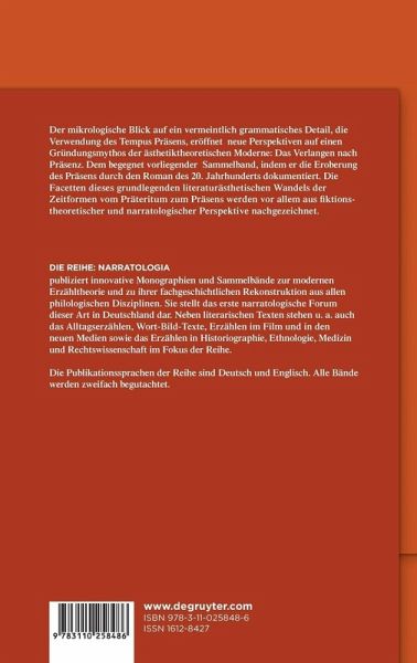 Der mikrologische Blick auf ein vermeintlich grammatisches Detail, die Verwendung des Tempus Präsens, eröffnet neue Perspektiven auf einen Gründungsmythos der ästhetiktheoretischen Moderne: Das Verlangen nach Präsenz. Dem begegnet vorliegender Sammelband, indem er die Eroberung des Präsens durch den Roman des 20. Jahrhunderts dokumentiert. Die Facetten dieses grundlegenden literaturästhetischen Wandels der Zeitformen vom Präteritum zum Präsens werden vor allem aus fiktionstheoretischer und narratologischer Perspektive nachgezeichnet.
