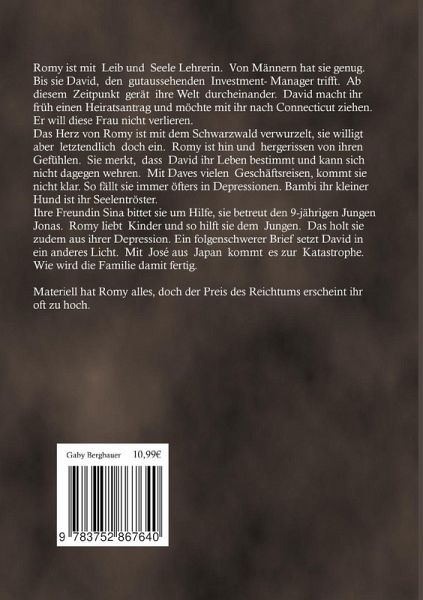 Romy ist mit Leib und Seele Lehrerin. Von Männern hat sie genug. Bis sie David, den gutaussehenden Investment-Manager trifft. Ab diesem Zeitpunkt gerät ihre Welt durcheinander. David macht ihr früh einen Heiratsantrag und möchte mit ihr nach Connecticut ziehen. Er will diese Frau nicht verlieren. Das Herz von Romy ist mit dem Schwarzwald verwurzelt, sie willigt aber letztendlich doch ein. Romy ist hin und hergerissen von ihren Gefühlen. Sie merkt, dass David ihr Leben bestimmt und kann sich nicht dagegen wehren. Mit Daves vielen Geschäftsreisen, kommt sie nicht klar. So fällt sie immer öfters in Depressionen. Bambi ihr kleiner Hund ist ihr Seelentröster.Ihre Freundin Sina bittet sie um Hilfe, sie betreut den 9-jährigen Jungen Jonas. Romy liebt Kinder und so hilft sie dem Jungen. Das holt sie zudem aus ihrer Depression. Ein folgenschwerer Brief setzt David in ein anderes Licht. Mit José aus Japan kommt es zur Katastrophe. Wie wird die Familie damit fertig. Materiell hat Romy alles, doch der Preis des Reichtums erscheint ihr oft zu hoch.