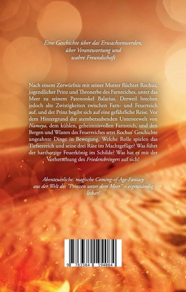 Eine Geschichte über das Erwachsenwerden, über Verantwortung, Loyalität und wahre Freundschaft. Für Leser_innen ab 16 Jahren.Nach einem Zerwürfnis mit seiner Mutter flüchtet Rochus, jugendlicher Prinz und Thronerbe des Farnreiches, unter das Meer zu seinem Patenonkel Balarius. Derweil brechen jedoch alte Zwistigkeiten zwischen Farn- und Feuerreich auf, und der Prinz begibt sich auf eine gefährliche Reise. Vor dem Hintergrund der atemberaubenden Unterseewelt von Namoya, dem kühlen, geheimnisvollen Farnreich, und den Bergen und Wüsten des Feuerreiches setzt Rochus' Geschichte ungeahnte Dinge in Bewegung. Welche Rolle spielen das Tiefseereich und seine drei Räte im Machtgefüge? Was führt der hartherzige Feuerkönig im Schilde? Was hat es mit der Vorhersehung des "Friedensbringers" auf sich?Abenteuerliche, magische Coming-of-Age-Fantasy aus der Welt des "Prinzen unter dem Meer" - eigenständig lesbar!