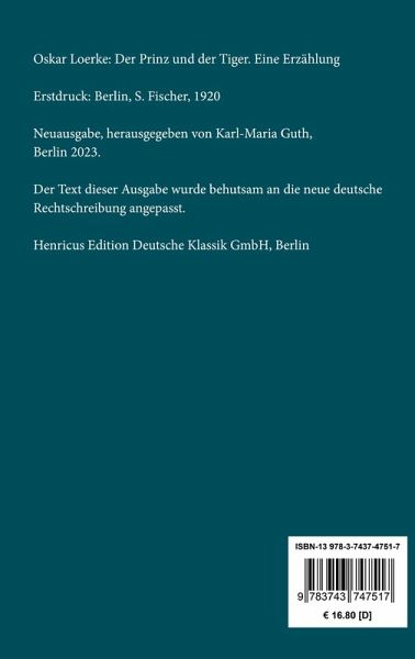 Oskar Loerke: Der Prinz und der Tiger. Eine ErzählungErstdruck: Berlin, S. Fischer, 1920.Neuausgabe, herausgegeben von Karl-Maria Guth, Berlin 2023.Der Text dieser Ausgabe wurde behutsam an die neue deutsche Rechtschreibung angepasst.Umschlagabbildung: Ernst Ludwig Kirchner, Nollendorfplatz, 1912Gesetzt aus der Minion Pro, 11 pt.Die Sammlung Hofenberg erscheint im Verlag Henricus - Edition Deutsche Klassik GmbH, Berlin