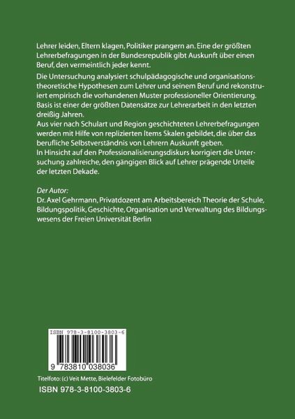.Lehrer leiden, Eltern klagen, Politiker prangern an. Eine der größten Lehrerbefragungen in der Bundesrepublik gibt Auskunft über einen Beruf, den vermeintlich jeder kennt. Die Untersuchung analysiert schulpädagogische und organisationstheoretische Hypothesen zum Lehrer und seinem Beruf und rekonstruiert empirisch die vorhandenen Muster professioneller Orientierung. Basis ist einer der größten Datensätze zur Lehrerarbeit in den letzten dreißig Jahren. Aus vier nach Schulart und Region geschichteten Lehrerbefragungen werden mit Hilfe von replizierten Items Skalen gebildet, die über das berufliche Selbstverständnis von Lehrern Auskunft geben. In Hinsicht auf den Professionalisierungsdiskurs korrigiert die Untersuchung zahlreiche, den gängigen Blick auf Lehrer prägende Urteile der letzen Dekade.
