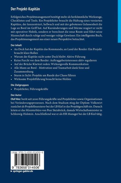 An Deck hat der Kapitän das Kommando, an Land der Reeder - Ein Projekt braucht klare Rollen.- Warum der Kapitän nicht unter Deck bleibt: Aktive Führung.- Keine Furcht vor dem Reeder: Auftraggeberinteressen aktiv regulieren.- Auf der Brücke Klartext reden - Wirkungsvolle Kommunikation.- Alle Mann an Bord - Motivation und Teamarbeit dank Sinn und Zusammenhang.- Sturm in Sicht - Projekte am Rande des Chaos führen.- Führung mit seemännischer Gelassenheit - Projektmanagement jenseits der Planwirtschaft.- Wirksame Projektführung braucht keine Helden.