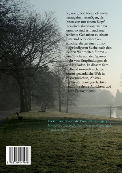 So, wie große Ideen oft mehr herzugeben vermögen, als ihnen von nur einem Kopf literarisch abverlangt werden kann, so sind es manchmal schlichte Gedanken zu einem Umstand oder einer Geschichte, die zu einer umso tiefgründigeren Suche nach den kleinen Wahrheiten führen - einer Suche auf den Spuren mehr von Empfindungen als von Kalkülen. In diesem Sammelband tummelt sich des Autors gedankliche Welt in Prosastückchen, Abstraktionen und Kurzgeschichten rund um seltene Ansichten und kleine Protagonisten.Dieser Band vereint die Prosa-Einzelausgaben 'Herzblühen', 'Zeitgerafft', 'Geisterbilder des Gemüts' und 'Nebelbankideen'.