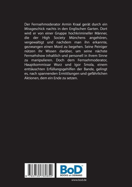 Der Fernsehmoderator Armin Kraal gerät durch ein Missgeschick nachts in den Englischen Garten. Dort wird er von einer Gruppe hochkrimineller Männer, die der High Society Münchens angehören, vergewaltigt und nachdem man ihn erkannte, gezwungen einen Mord zu begehen. Seine Peiniger nützen ihr Wissen darüber, um seine nächste Fernsehshow inhaltlich und personell in ihrem Sinne zu manipulieren. Doch dem Fernsehmoderator, Hauptkommissar Wurz und Igor Smola, einem enttäuschten Erfüllungsgehilfen der Bande, gelingt es, nach spannenden Ermittlungen und gefährlichen Aktionen, dem ein Ende zu setzen.