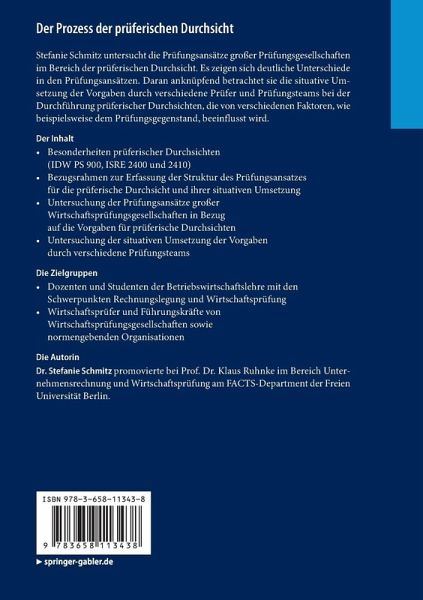 Stefanie Schmitz untersucht die Prüfungsansätze großer Prüfungsgesellschaften im Bereich der prüferischen Durchsicht. Es zeigen sich deutliche Unterschiede in den Prüfungsansätzen. Daran anknüpfend betrachtet sie die situative Umsetzung der Vorgaben durch verschiedene Prüfer und Prüfungsteams bei der Durchführung prüferischer Durchsichten, die von verschiedenen Faktoren, wie beispielsweise dem Prüfungsgegenstand, beeinflusst wird.