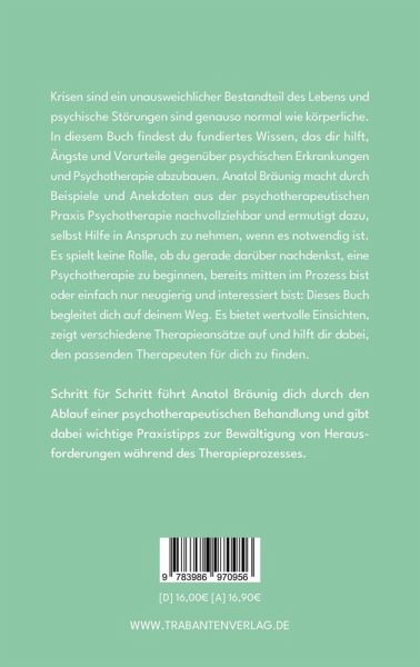 Krisen sind ein unausweichlicher Bestandteil des Lebens und psychische Störungen sind genauso normal wie körperliche. In diesem Buch findest du fundiertes Wissen, das dir hilft, Ängste und Vorurteile gegenüber psychischen Erkrankungen und Psychotherapie abzubauen. Anatol Bräunig macht durch Beispiele und Anekdoten aus der psychotherapeutischen Praxis Psychotherapie nachvollziehbar und ermutigt dazu, selbst Hilfe in Anspruch zu nehmen, wenn es notwendig ist. Es spielt keine Rolle, ob du gerade darüber nachdenkst, eine Psychotherapie zu beginnen, bereits mitten im Prozess bist oder einfach nur neugierig und interessiert bist: Dieses Buch begleitet dich auf deinem Weg. Es bietet wertvolle Einsichten, zeigt verschiedene Therapieansätze auf und hilft dir dabei, den passenden Therapeuten für dich zu finden. Schritt für Schritt führt Anatol Bräunig dich durch den Ablauf einer psychotherapeutischen Behandlung und gibt dabei wichtige Praxistipps zur Bewältigung von Herausforderungen während des Therapieprozesses.