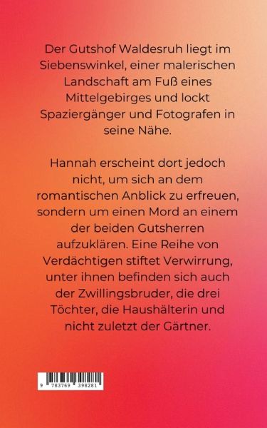 Ein Mord auf dem Gutshof - und eine Frau, die sich nicht täuschen lässt Der Gutshof Waldesruh liegt malerisch im Siebenswinkel, ein Ort voller Ruhe, Natur - und eines Tages: ein Tatort. Als einer der beiden Gutsherren ermordet wird, taucht Hannah auf. Nicht als Besucherin, sondern als Ermittlerin. Zwischen Apfelbäumen, Zwillingen und verstohlenen Blicken entspinnt sich ein verzweigtes Netz aus Geheimnissen. Der Kreis der Verdächtigen ist klein - doch jeder scheint ein Motiv zu haben: die Haushälterin, der Gärtner, die Töchter, sogar der Bruder des Opfers. Hannah vertraut ihrem Instinkt und stellt Fragen, die niemand hören will. Was wie ein idyllischer Rückzugsort wirkt, entpuppt sich als Bühne für Eifersucht, Neid und alte Wunden. Mit feinem Gespür und klarem Verstand folgt Hannah der Spur - bis zur alles entscheidenden Frage: Wer spielt hier ein doppeltes Spiel? Ein atmosphärischer Cosy Crime für alle, die feinsinnige Spannung und charmante Ermittlerinnen lieben.