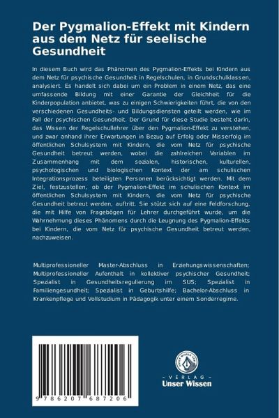 In diesem Buch wird das Phänomen des Pygmalion-Effekts bei Kindern aus dem Netz für psychische Gesundheit in Regelschulen, in Grundschulklassen, analysiert. Es handelt sich dabei um ein Problem in einem Netz, das eine umfassende Bildung mit einer Garantie der Gleichheit für die Kinderpopulation anbietet, was zu einigen Schwierigkeiten führt, die von den verschiedenen Gesundheits- und Bildungsdiensten geteilt werden, wie im Fall der psychischen Gesundheit. Der Grund für diese Studie besteht darin, das Wissen der Regelschullehrer über den Pygmalion-Effekt zu verstehen, und zwar anhand ihrer Erwartungen in Bezug auf Erfolg oder Misserfolg im öffentlichen Schulsystem mit Kindern, die vom Netz für psychische Gesundheit betreut werden, wobei die zahlreichen Variablen im Zusammenhang mit dem sozialen, historischen, kulturellen, psychologischen und biologischen Kontext der am schulischen Integrationsprozess beteiligten Personen berücksichtigt werden. Mit dem Ziel, festzustellen, ob der Pygmalion-Effekt im schulischen Kontext im öffentlichen Schulsystem mit Kindern, die vom Netz für psychische Gesundheit betreut werden, auftritt. Sie stützt sich auf eine Feldforschung, die mit Hilfe von Fragebögen für Lehrer durchgeführt wurde, um die Wahrnehmung dieses Phänomens durch die Leugnung des Pygmalion-Effekts bei Kindern, die vom Netz für psychische Gesundheit betreut werden, nachzuweisen.