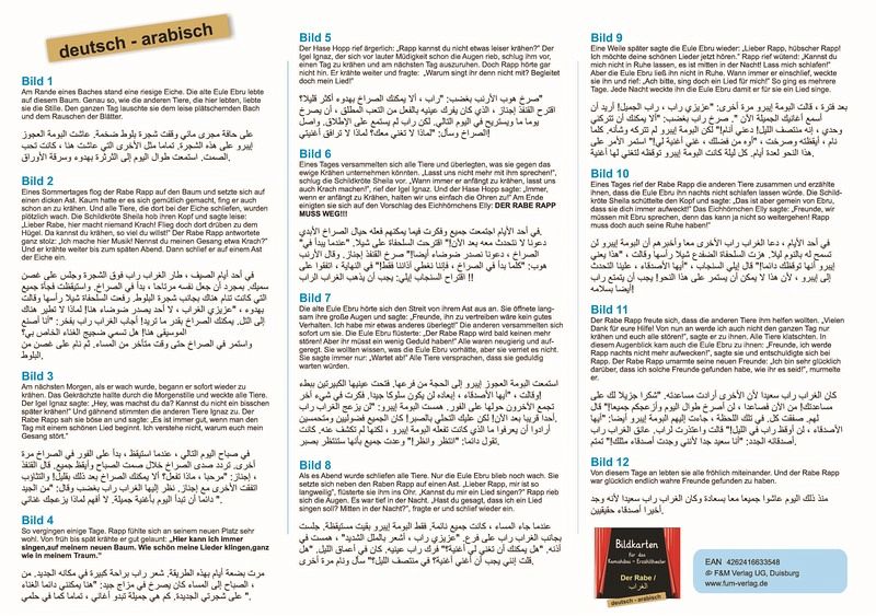 Zweisprachiges Kniebuch der Bilderbuchgeschichte "Der Rabe" in deutsch - arabisch- Bilderbuch mit Spiralbindung im DINA4 - Format (21,0 x 29,7 cm), auf festem 300g-Bilderdruck- farbig illustriert- ideal zur Sprachförderung- kompletter Text auf separater Seite zum Vorlesen in deutsch und arabisch- ideale Ergänzung zum KamishibaiDas Kniebuch ist perfekt für die Sprachförderung in der Kita oder zum Zweitspracherwerb.. Thema Streit:Eines Sommertages setzte sich ein Rabe auf einen Baum, in einem ruhigen und friedlichen Wald, und begann ständig zu krähen, so dass er alle Waldbewohner in ihrer Ruhe gestört wurden. Wie konnten sie dem Raben vermitteln, dass das Gekrächze sie störte? Doch die schlaue Eule Ebru wusste einen Rat...NEU - Jetzt auch als KAMISHIBAI erhältlich!Alle Kamishibais und Kniebücher sind in 27 verschiedenen Sprachen erhältlich: