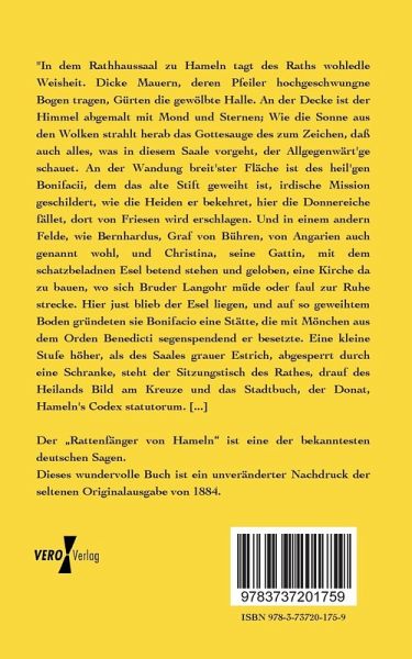 "In dem Rathhaussaal zu Hameln tagt des Raths wohledle Weisheit. Dicke Mauern, deren Pfeiler hochgeschwungne Bogen tragen, Gürten die gewölbte Halle. An der Decke ist der Himmel abgemalt mit Mond und Sternen; Wie die Sonne aus den Wolken strahlt herab das Gottesauge des zum Zeichen, daß auch alles, was in diesem Saale vorgeht, der Allgegenwärt'ge schauet. An der Wandung breit'ster Fläche ist des heil'gen Bonifacii, dem das alte Stift geweiht ist, irdische Mission geschildert, wie die Heiden er bekehret, hier die Donnereiche fället, dort von Friesen wird erschlagen. Und in einem andern Felde, wie Bernhardus, Graf von Bühren, von Angarien auch genannt wohl, und Christina, seine Gattin, mit dem schatzbeladnen Esel betend stehen und geloben, eine Kirche da zu bauen, wo sich Bruder Langohr müde oder faul zur Ruhe strecke. Hier just blieb der Esel liegen, und auf so geweihtem Boden gründeten sie Bonifacio eine Stätte, die mit Mönchen aus dem Orden Benedicti segenspendend er besetzte. Eine kleine Stufe höher, als des Saales grauer Estrich, abgesperrt durch eine Schranke, steht der Sitzungstisch des Rathes, drauf des Heilands Bild am Kreuze und das Stadtbuch, der Donat, Hameln's Codex statutorum. Um den Tisch im Halbkreis sitzen auf den lederüberzognen, hochgelehnten Polsterstühlen die zwölf Rathsherrn, und den Vorsitz führ Herr Wichard Gruwelholt, Hameln's wackrer Bürgermeister. [...]