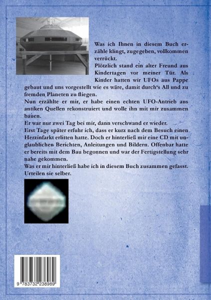 Was ich Ihnen in diesem Buch erzähle klingt, zugegeben, vollkommen verrückt.Plötzlich stand ein alter Freund aus Kindertagen vor meiner Tür. Als Kinder hatten wir UFOs aus Pappe gebaut und uns vorgestellt wie es wäre, damit durch's All und zu fremden Planeten zu fliegen.Nun erzählte er mir, er habe einen echten UFO-Antrieb aus antiken Quellen rekonstruiert und wolle ihn mit mir zusammen bauen.Er war nur zwei Tag bei mir, dann verschwand er wieder.Erst Tage später erfuhr ich, dass er kurz nach dem Besuch einen Herzinfarkt erlitten hatte. Doch er hinterließ mir eine CD mit unglaublichen Berichten, Anleitungen und Bildern. Offenbar hatte er bereits mit dem Bau begonnen und war der Fertigstellung sehr nahe gekommen.Was er mir hinterließ habe ich in diesem Buch zusammen gefasst. Urteilen sie selber.