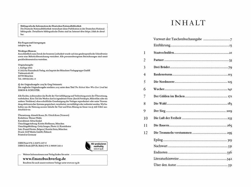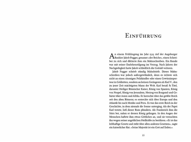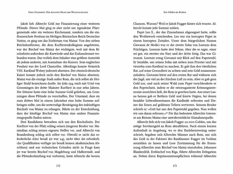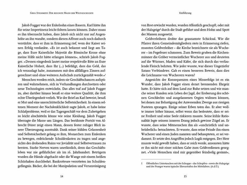 ... von Wagemut und Intrigen, Netzwerken und Machtspielen eines Spekulanten, vorausschauenden Geschäftsmannes und Philanthropen. Lesen! EURuro "Dies ist die fesselnde Geschichte wie Fugger das Libretto zur Geldvermehrung schrieb [...]. Ein Muss für jeden, der sich für Geschichte und Vermögensaufbau interessiert." Bryan Burrough, Autor von "Days of Rage" and Co-Autor von "Barbarians at the Gate" "Greg Steinmetz hat die unwahrscheinliche und doch wahre Geschichte des ersten modernen Kapitalisten der Weltgeschichte ausgegraben. Im Deutschland des 15. Jahrhunderts geboren, überwand er seine niedere Geburt und machte ein Vermögen im Bank-, Textil- und Minengeschäft, das [...] immer das größte jemals erwirtschaftete Vermögen ist. Ein Moneymaker aus langvergangener Zeit, der, bei den heutigen Königen Midas zu Hause wäre." Roger Lowenstein, Autor von "Der große Irrtum" und "Buffett: Die Geschichte eines amerikanischen Kapitalisten" "Jakob Fugger war der Rockefeller der Renaissance. Er war ein kapitalistisches Genie, das mit Greg Steinmetz endlich den Biographen gefunden hat, den er verdient. Steinmetz' energiegeladene Geschichte über Geld, religiöse Unruhen, politische Täuschungsmanöver und gewaltsame Zusammenstöße der Disziplinen "Kapitalismus" und "Kommunismus" ist zeitlos und gleichzeitig brandaktuell." James Grant (Autor von The Forgotten Depression: 1921 - The Crash That Cured Itself "Als einer der einflussreichsten Finanziers, der jemals gelebt hat, war Jakob Fugger lange ein Mysterium. Wenn Sie diesen visionären, streitlustigen und waghalsigen Money-Man verstehen wollen, lesen Sie Greg Steinmetz' fesselnde und klare Biographie. Es wird Sie bereichern." Laurence Bergreen, Autor von Columbus: The Four Voyages and Over the Edge of the World: Magellan's Terrifying Circumnavigation of the Globe "Greg Steinmetz hat das Renaissance-Äquivalent des heutigen Zelig vor den Fußnoten der Geschichte gerettet. Das Finanzgenie Jakob Fugger taucht in nahezu jedem kritischen Moment seiner Zeit auf. Könige, Kaiser und Päpste - alle kannten ihn. Nun, Dank des bemerkenswert recherchierten und faszinierenden Buches lernen auch wir ihn kennen." Steve Stecklow, Pulitzer-Preisträger "Faszinierend." Andrew Ross Sorkin, The New York Times & Bestsellerautor "Unterhaltsam, schön zu lesen und tempogeladen." The Wall Street Journal "Die Geschichte von Fuggers Ambitionen, Rücksichtslosigkeit und Habgier sind fesselnd." The Economist "Erzählt eine faszinierende und zur Vorsicht mahnende Geschichte über zügellosen Kapitalismus besonders in Wirtschaftsräumen, die von autokratischen Machthabern gelenkt werden." The New York Times "Einer der einflussreichsten Geschäftsleute der Geschichte wir farbenfroh vorgestellt." New York Times Book Review