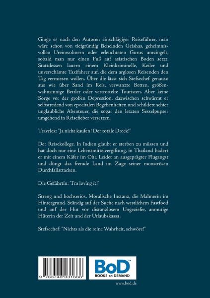 Ginge es nach den Autoren einschlägiger Reiseführer, man wäre schon von tiefgründig lächelnden Geishas, geheimnisvollen Ureinwohnern oder erleuchteten Gurus umzingelt, sobald man nur einen Fuß auf asiatischen Boden setzt. Stattdessen lauern einem Kleinkriminelle, Keiler und unverschämte Taxifahrer auf, die dem arglosen Reisenden den Tag vermiesen wollen. Über die lässt sich Stefsechef genauso aus wie über Sand im Reis, verwanzte Betten, größenwahnsinnige Bettler oder vertrottelte Touristen. Aber keine Sorge vor der großen Depression, dazwischen schwärmt er selbstredend von epochalen Begebenheiten und schildert schier unglaubliche Abenteuer, die sogar den letzten Sesselpupser umgehend in Reisefieber versetzen.Travelex: ''Ja nicht kaufen! Der totale Dreck!''Der Reisekollege. In Indien glaubt er sterben zu müssen und hat doch nur eine Lebensmittelvergiftung, in Thailand hadert er mit einem Käfer im Ohr. Leidet an ausgeprägter Flugangst und düngt das fremde Land im Zuge seiner monströsen Durchfallattacken.Die Gefährtin: ''I'm loving it!''Streng und hochseriös. Moralische Instanz, die Mahnerin im Hintergrund. Ständig auf der Suche nach westlichem Fastfood und auf der Hut vor distanzlosem Ungeziefer, anmutige Hüterin der Zeit und der Urlaubskassa.Stefsechef: ''Nichts als die reine Wahrheit, schwöre!''Ein gewöhnlicher Reisender, der sich unvermutet mit den seltsamsten Umständen konfrontiert sieht, während er versucht, mit Anstand und Stil die Fremde zu erkunden.